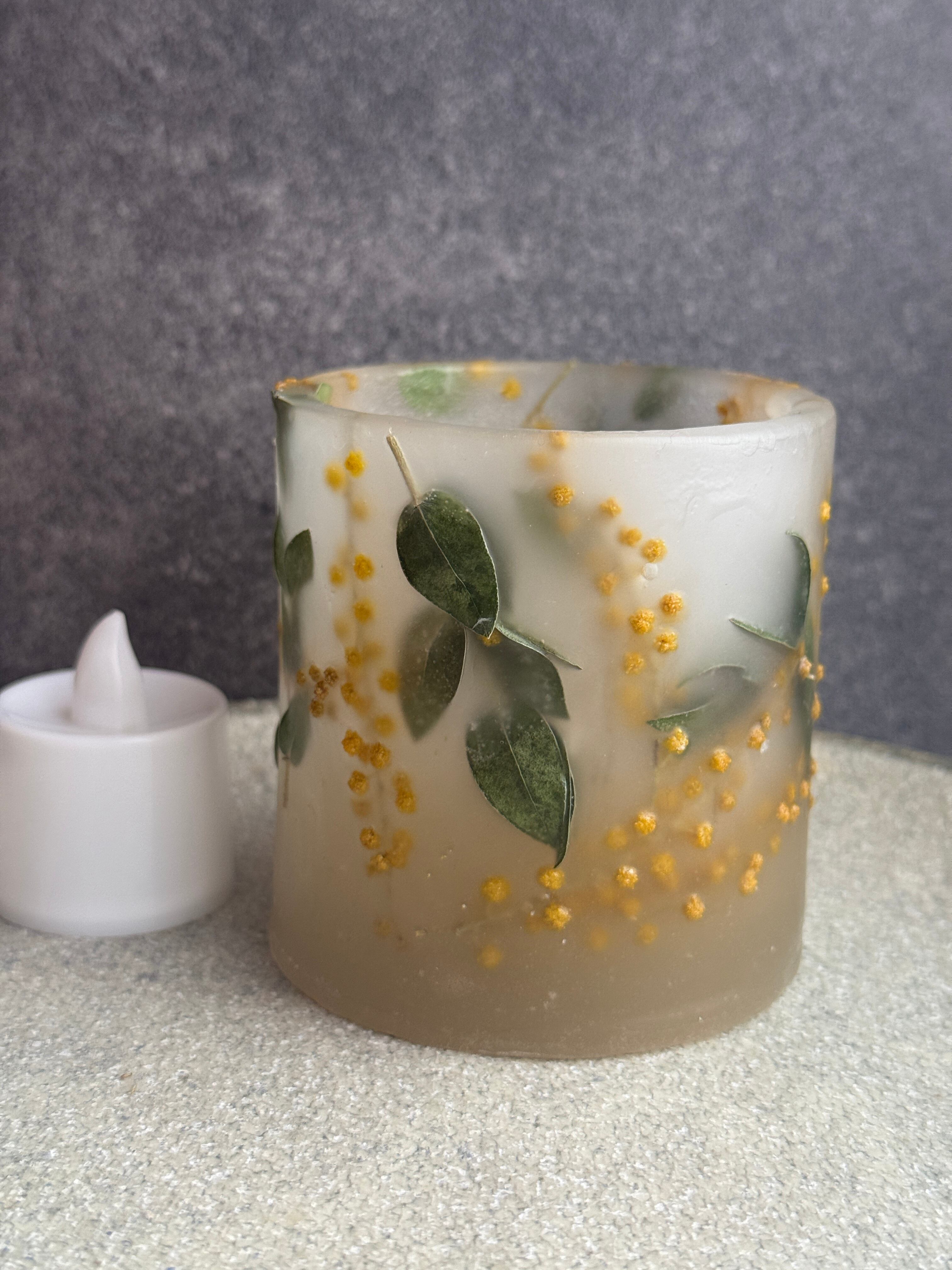 2025年に咲いたミモザをユーカリとともにキャンドルに閉じ込めました。